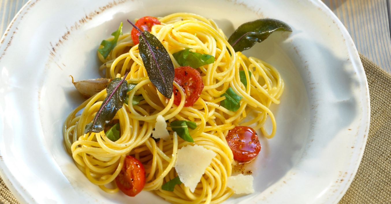 Jakmile jsou těstoviny hotové, scedíme je a přidáme je k rajčatům do pánve. Dobře promícháme, podle potřeby dochutíme a odstavíme. Úplně nakonec do špaget vmícháme nasekanou rukolu a podáváme. Každý talíř poté zdobíme parmazánem a křupavými lístky šalvěje.