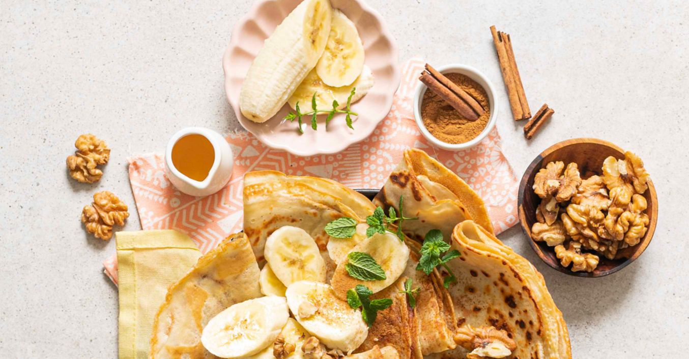 Palačinky podávejte s medem, banánem, tvarohem, vlašskými ořechy a čerstvou mátou.