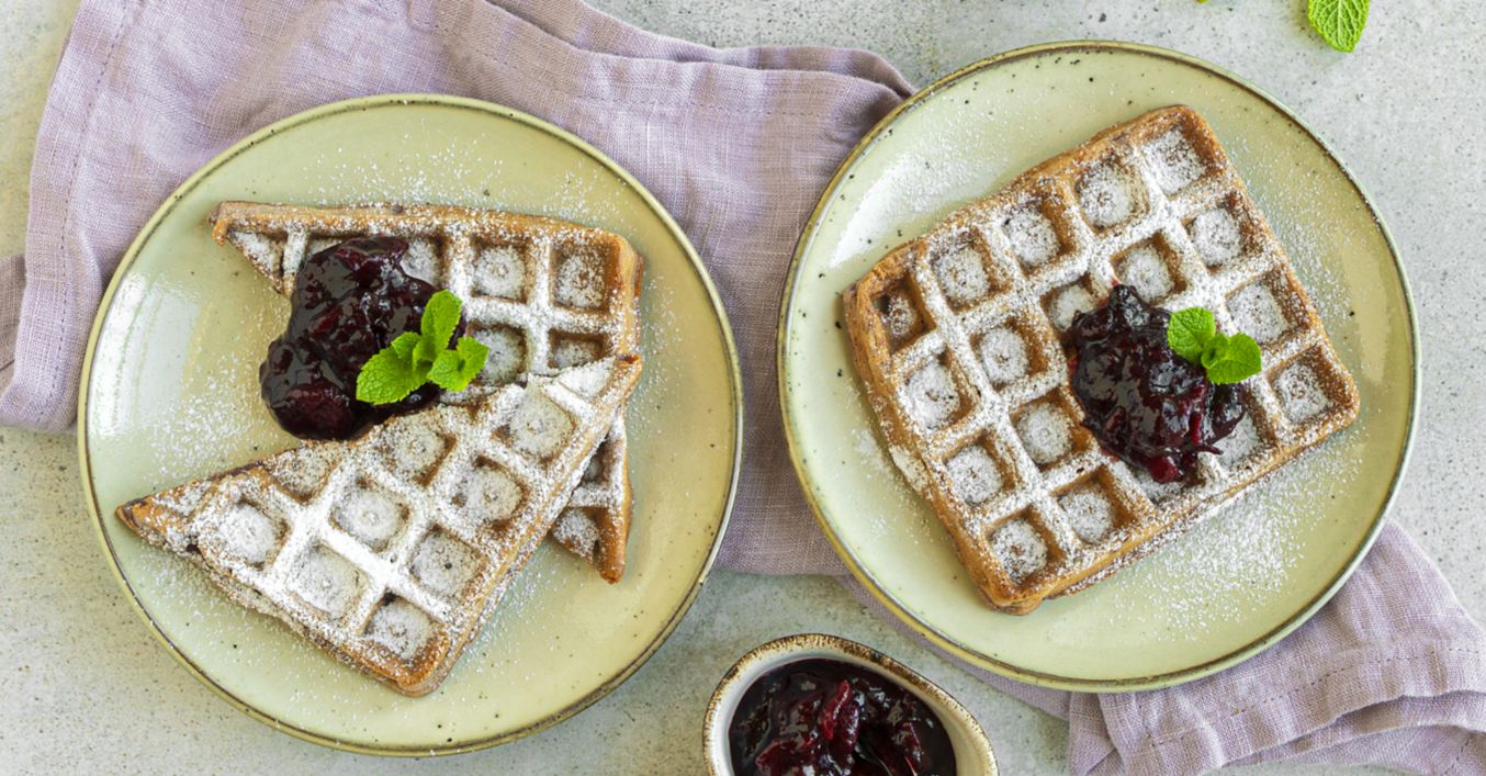 Vafle podávejte s moučkovým cukrem, ostružinovým rozvarem, čerstvými ostružinami a mátou.