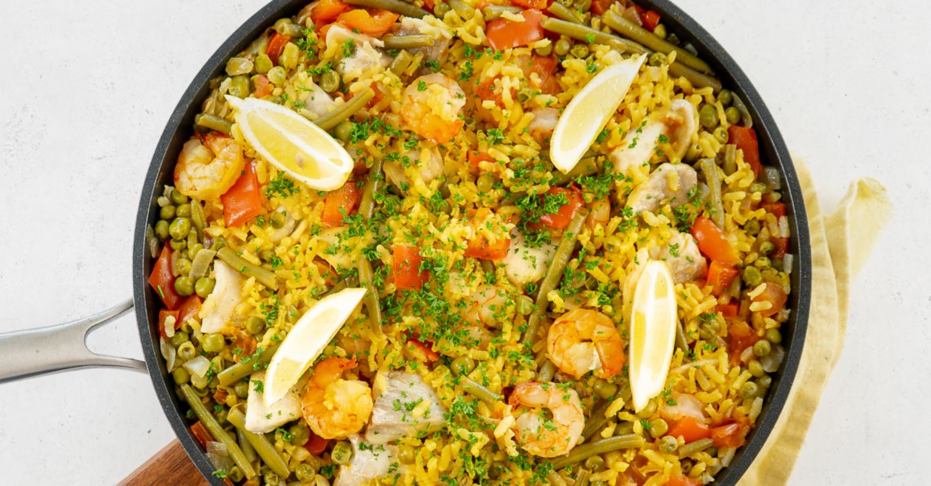 Na konci do pánve přidáme kousky ryby a krevety, promícháme, přiklopíme a velmi pomalu dusíme dalších 15 minut. Pokud by se nám obsah pánve vysušil, podlijeme ještě trochou vývaru navíc. Hotovou paellu zdobíme najemno nasekanou petrželkou a dílky citronu.