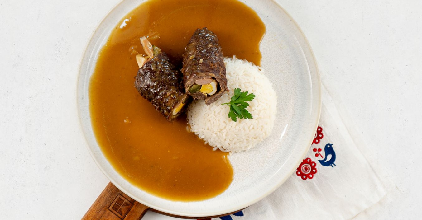 Maso z obou stran osolíme a opepříme. Uvnitř je potřeme hořčicí, přidáme párek, okurku, vejce a slaninu. Poté opatrně zabalíme do závitku a svážeme nití.