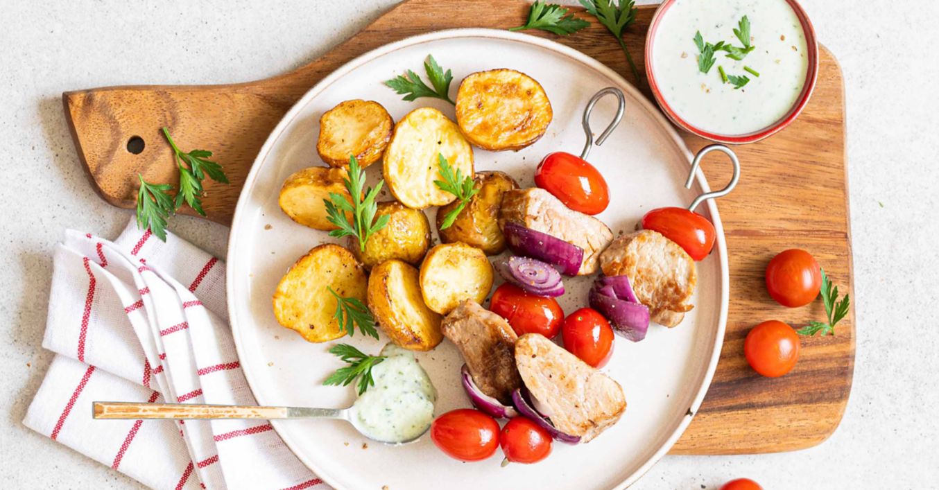 Špízy z vepřové panenky se zeleninou a bylinkovým dresingem