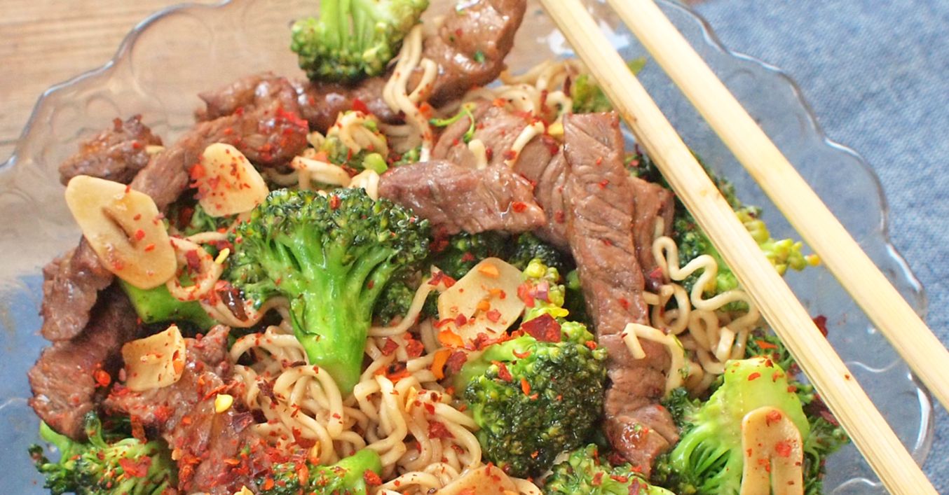 Přidáme zbylý olej, brokolici a také prudce orestujeme. Zalijeme vývarem, přivedeme k varu a povaříme asi 5 až 8 minut. Přidáme nudle a orestujeme spolu s brokolicí. Přidáme maso, promícháme a ihned servírujeme.
