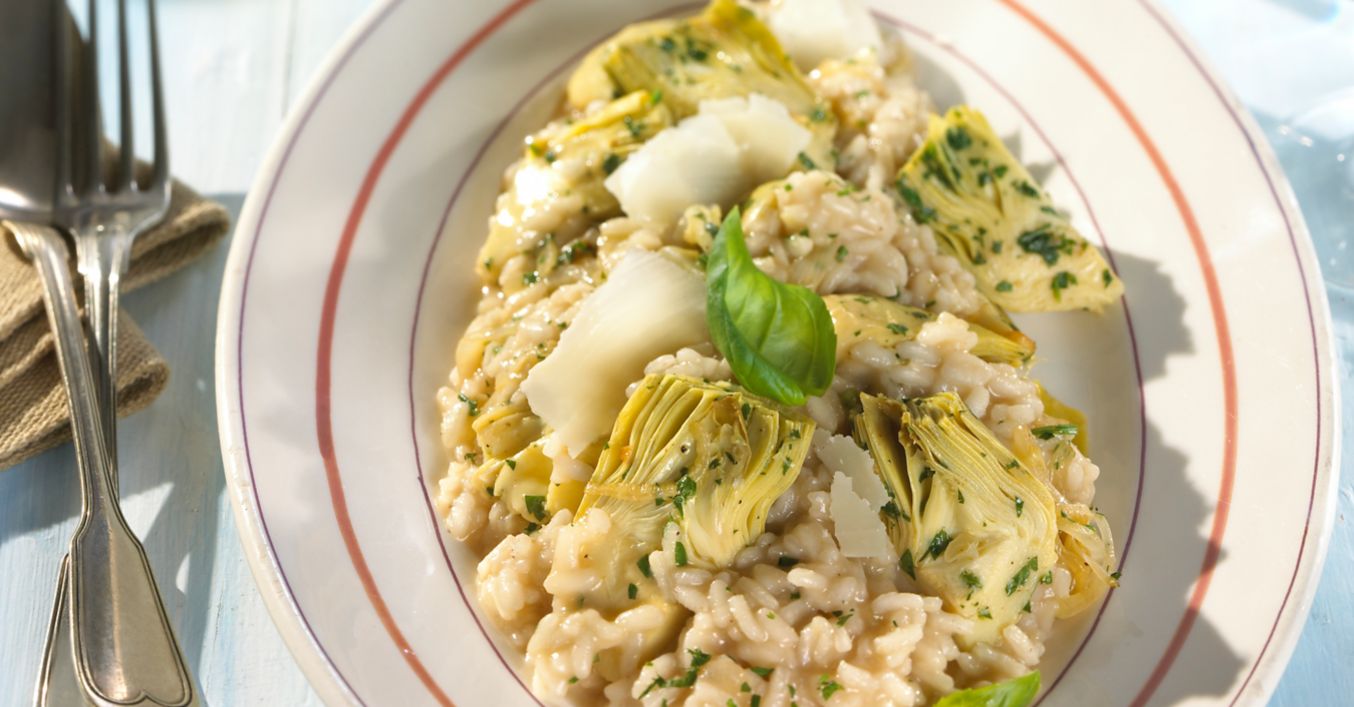 Na druhé pánvi si rozehřejeme olivový olej a krátce na něm opečeme srdíčka artyčoků s najemno nasekaným česnekem a petrželkou. Hotové artyčoky vmícháme do risotta a ihned podáváme.