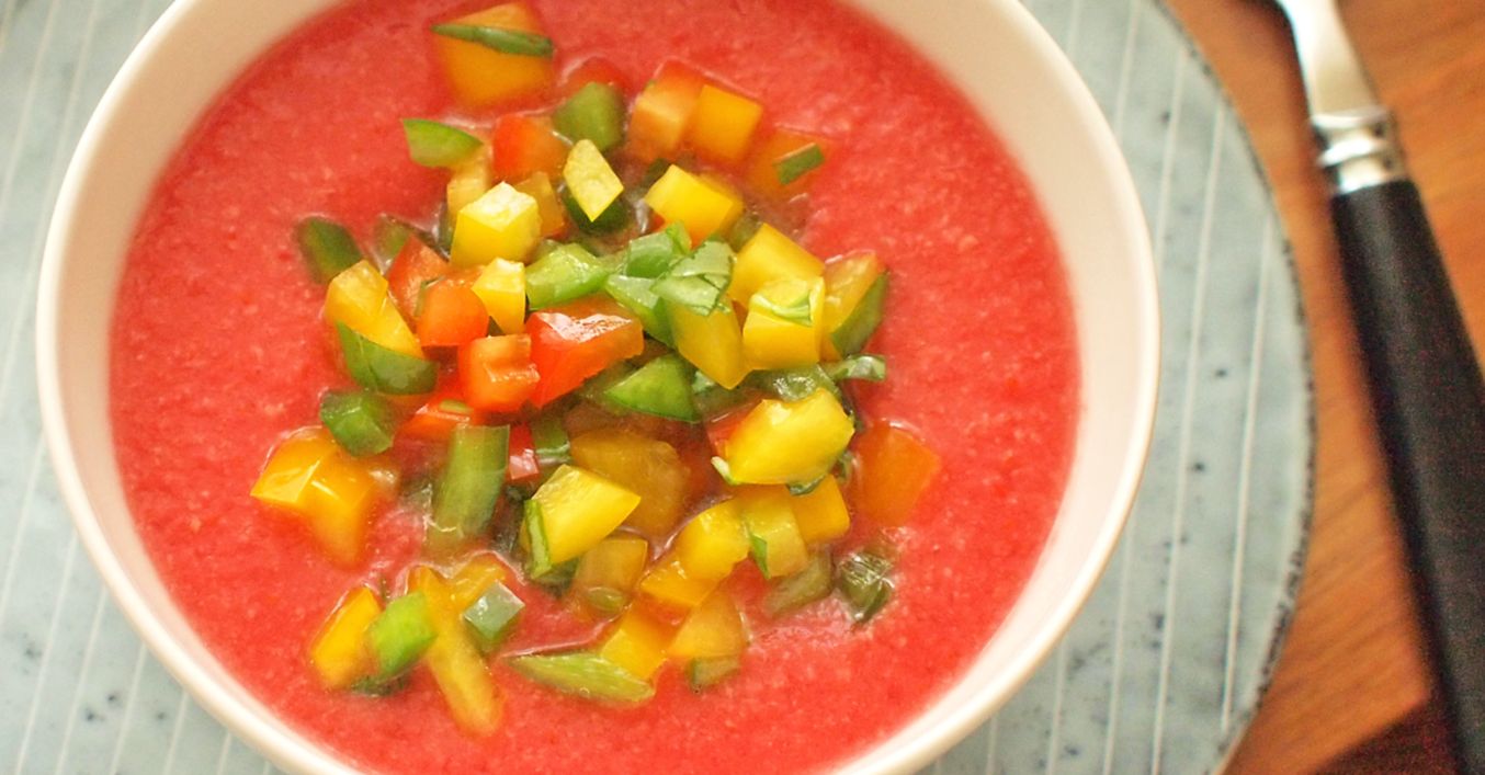 V mixéru rozmixujeme meloun, rajčata, papriky, česnek, cibuli a olivový olej. Podle chuti osolíme, opepříme a okyselíme vinným octem. Před podáváním vychladíme v lednici.