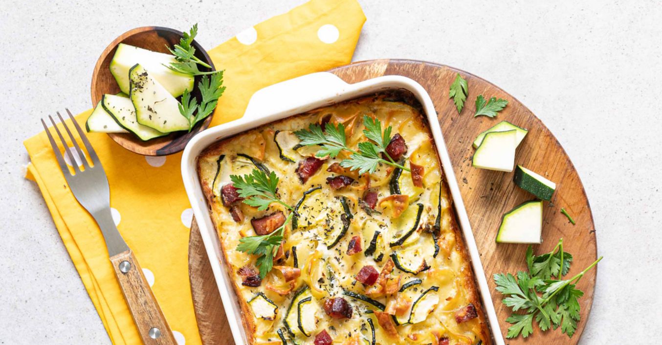 Uvařené těstoviny promíchejte s uzeným masem a cuketou. Přemístěte do formy vytřené olejem.