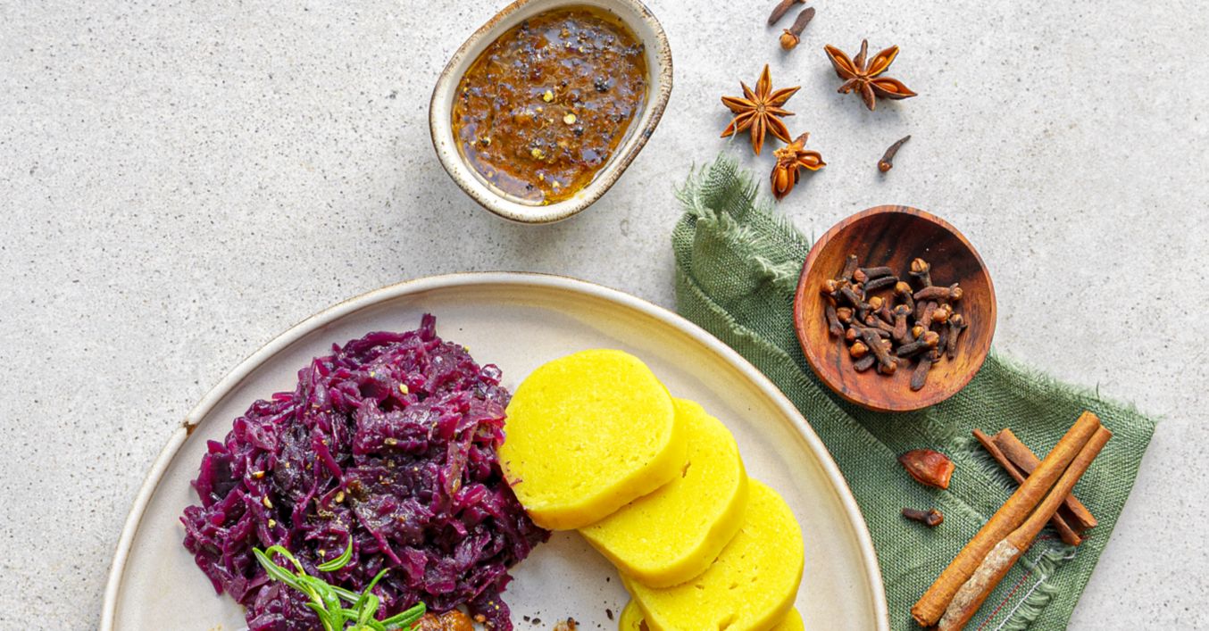 V hrnci rozpalte olej. Cibuli orestujte na oleji dozlatova. Poté přimíchejte červené zelí, zalijte vodou tak, aby bylo ponořené a vařte 30-40 minut, dokud zelí nezměkne. Pak vmíchejte mouku, sůl, pepř, drcený kmín, jablečný ocet a cukr.