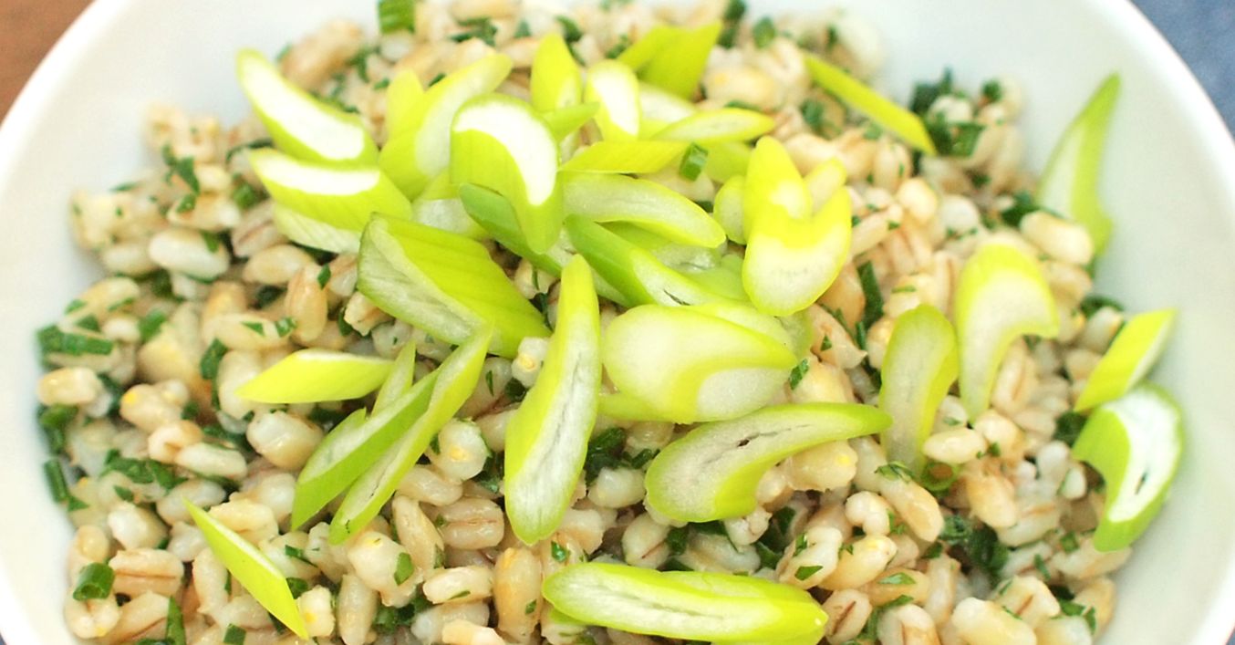 V hrnci rozehřejeme máslo, přidáme jarní cibulku a krátce orestujeme. Vmícháme kroupy, bylinky a jen krátce prohřejeme. Podle potřeby dochutíme solí a trochou citronové šťávy.