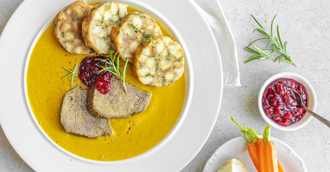 Maso nakrájejte na plátky. Podávejte s omáčkou, karlovarským knedlíkem, nakládanými brusinkami a čerstvým rozmarýnem.