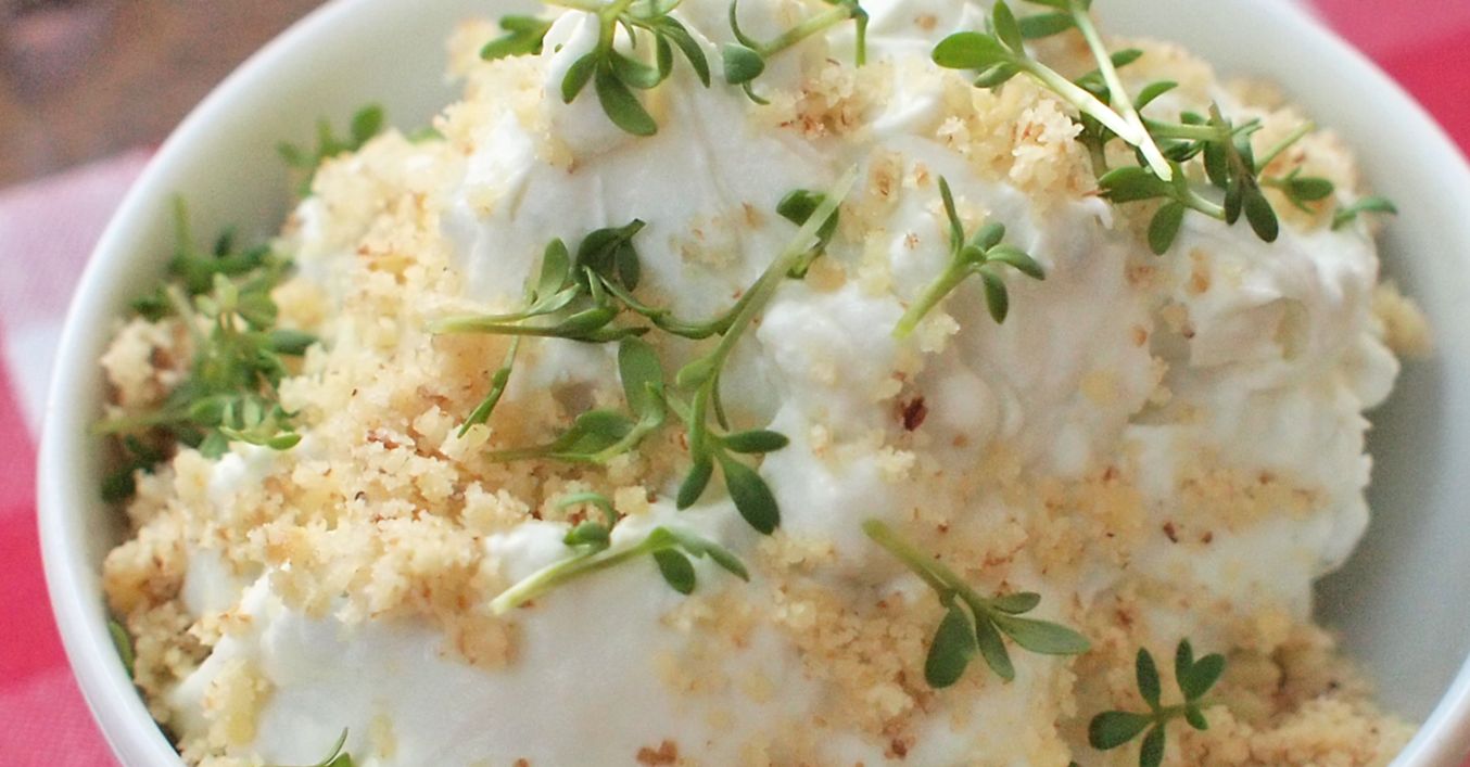 Vlašské ořechy krátce opražíme nasucho na pánvi a nasekáme nadrobno. Vmícháme do pomazánky, necháme uležet a podáváme.