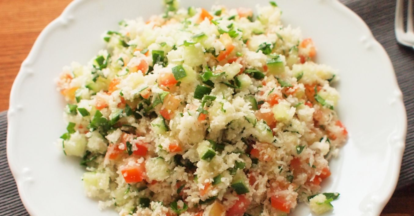 V míse promícháme květák, rajčata, okurku, petržel a olivový olej. Dochutíme solí, pepřem a citronovou šťávou.