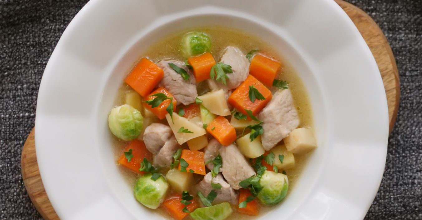 Telecí maso očistíme a nakrájíme na větší kostky, které osolíme. Celer, mrkev a petržel očistíme a nakrájíme na drobné kostky. Růžičkovou kapustu zbavíme vrchních oschlých slupek a nakrájíme na poloviny. Koření si svážeme do kousku gázy.