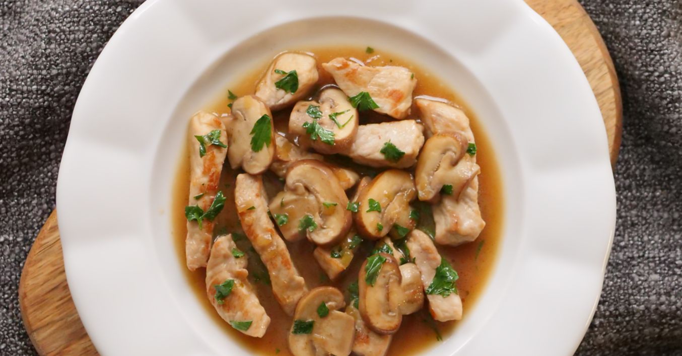 K houbám vrátíme maso, vše zalijeme vývarem a podusíme společně do změknutí a zhoustnutí (asi 25 minut). Nakonec vsypeme bylinky.