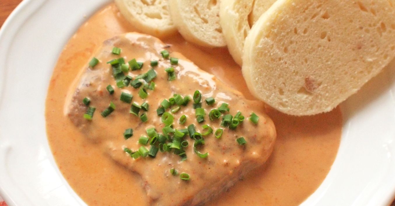 Odstavíme, plátky vyjmeme a dáme stranou. Do omáčky vmícháme smetanu a rozmixujeme tyčovým mixérem dohladka. Podáváme společně s telecími plátky.