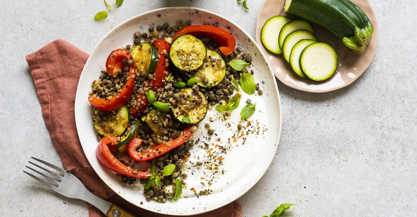 Teplý čočkový salát s quinoou a grilovanou zeleninou