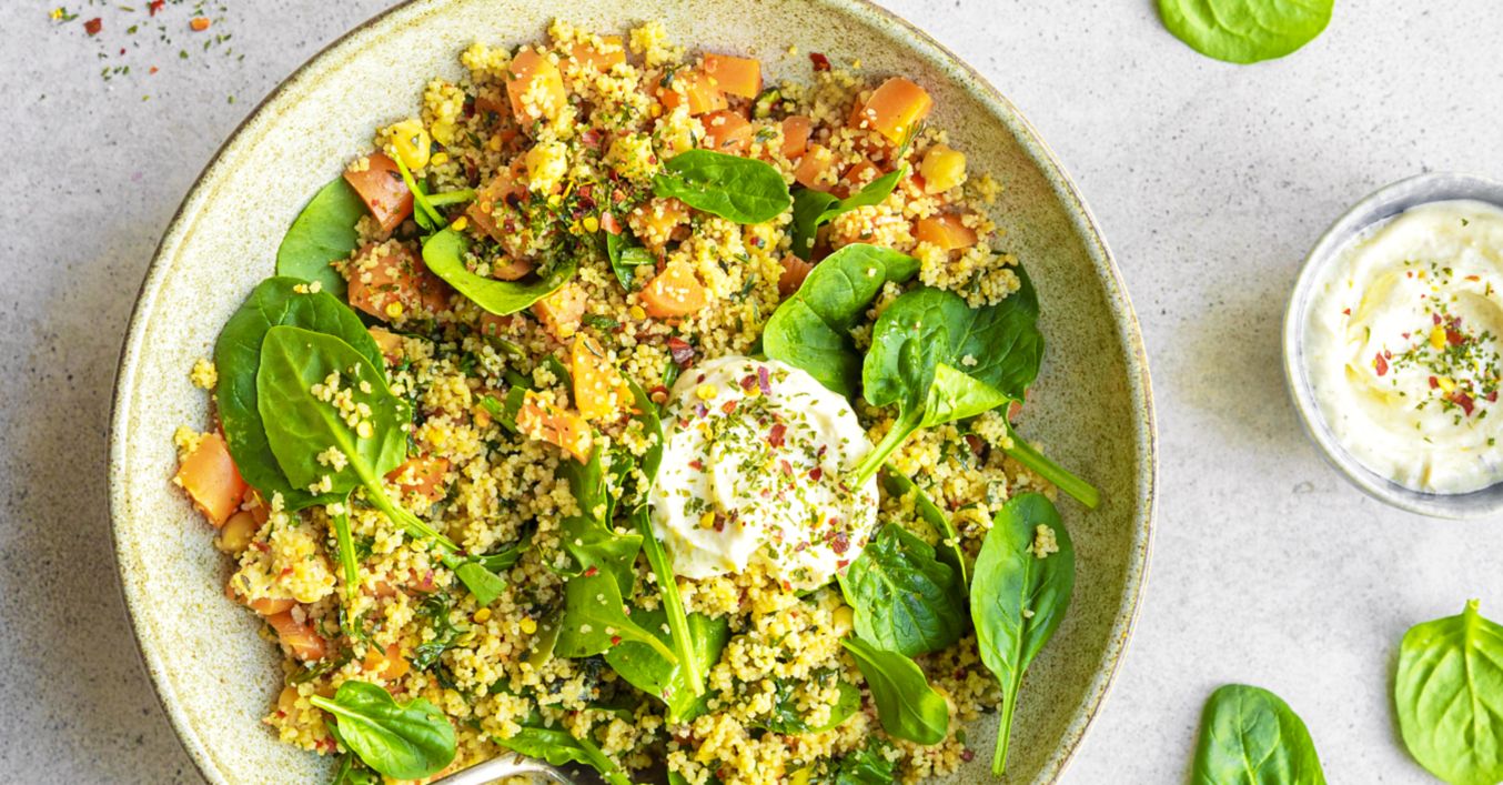 Do pánve dejte špenát a nechte zavadnout. Pak přidejte kuskus, cizrnu, oregano, sůl a černý mletý pepř.