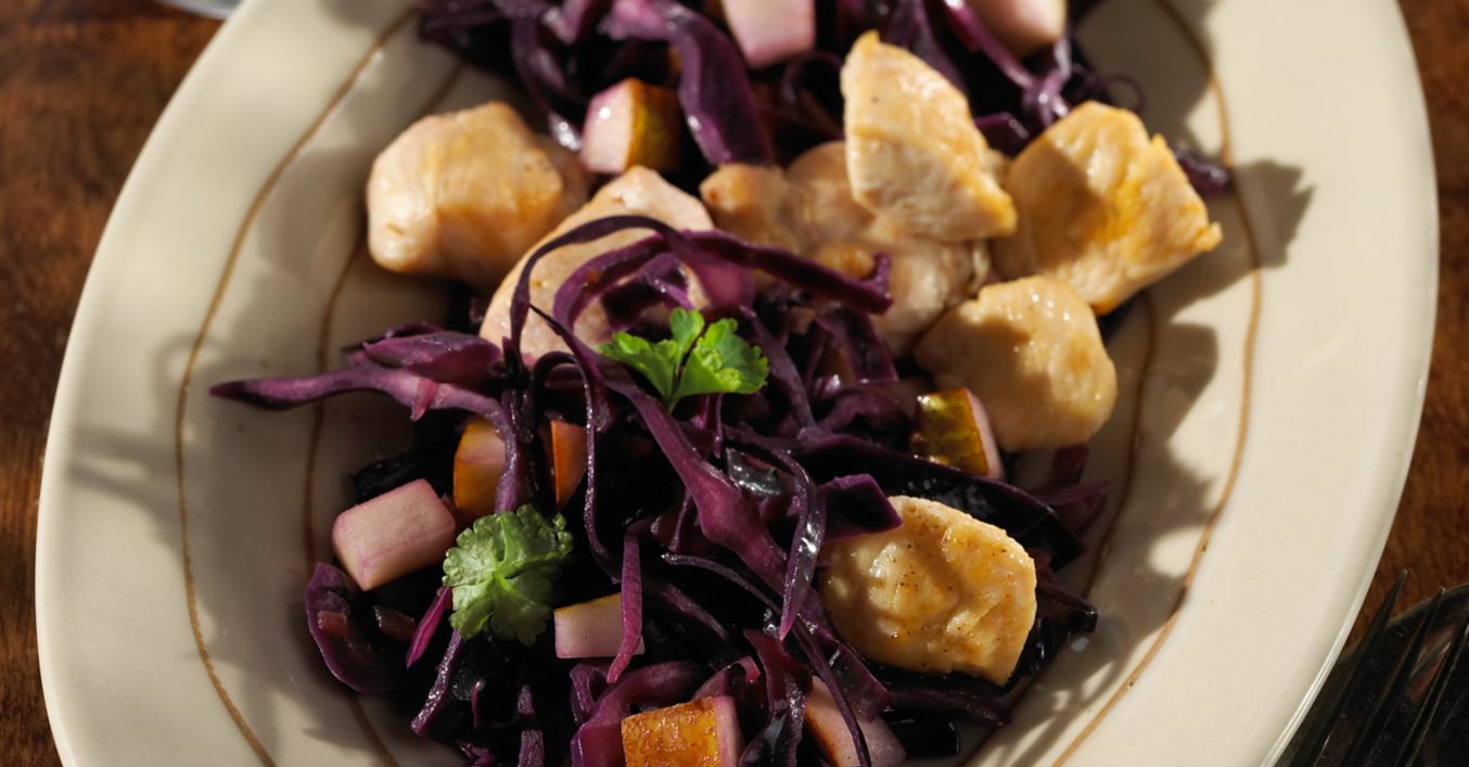 Zelí očistíme, zbavíme košťálu, zavadlých listů a nakrouháme najemno. Cibuli oloupeme a nakrájíme nadrobno. Hrušku zbavíme jádřince a nakrájíme na kostičky. Kuřecí prsa nakrájíme na kostky, osolíme a opepříme.