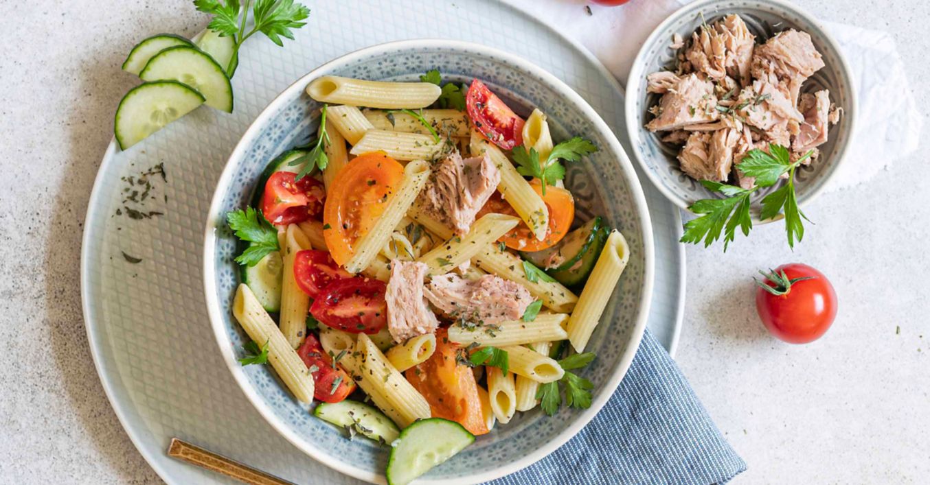 Rajčata nakrájejte na měsíčky, okurku na plátky. Přidejte k těstovinám spolu s tuňákem.