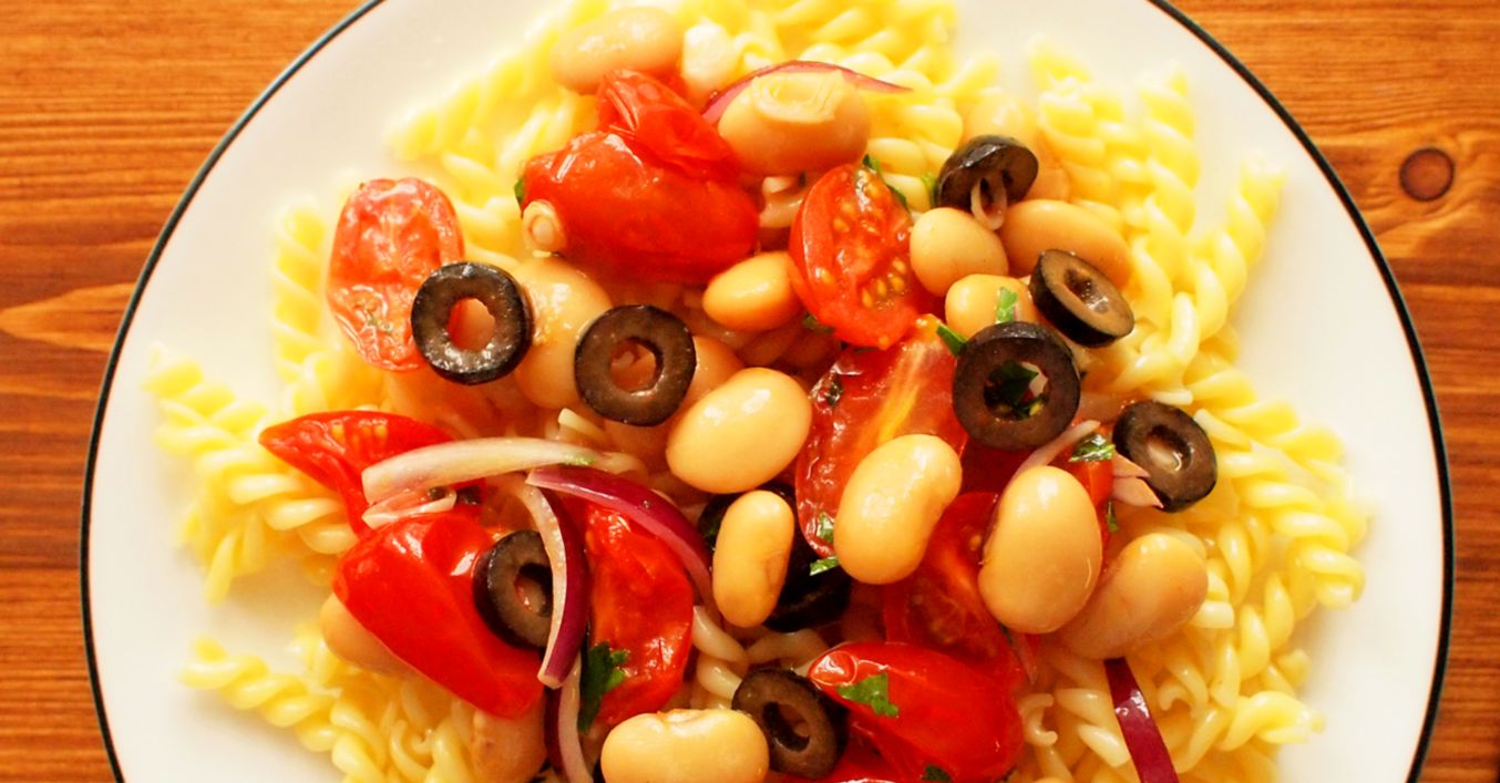 Rajčata očistíme a nakrájíme na poloviny. Fazole scedíme a necháme okapat. Olivy vypeckujeme nakrájíme na kolečka. Česnek oloupeme a nakrájíme na plátky.