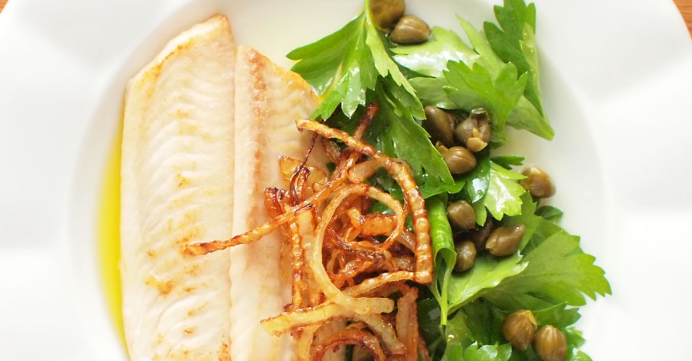 Do misky dáme ocet a hořčici. Rozmícháme a postupně zašleháme 2 lžíce olivového oleje. Přidáme kapary, poté rozmícháme s obranou petrželkou (bez stonků). Rybí filety podáváme společně s petrželovým salátem a křupavou cibulkou.