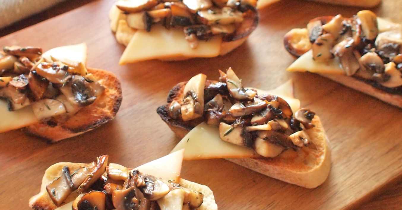Bagetu nakrájíme na plátky a opečeme v toastovači dozlatova. Šalotku s česnekem oloupeme a nasekáme nadrobno. Žampiony očistíme a nakrájíme na plátky.