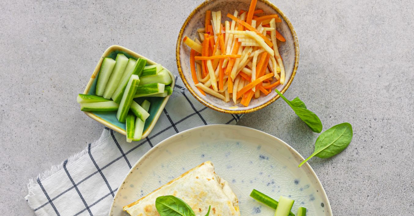 Mrkev, jablko a okurku nakrájejte na tenké proužky. Promíchejte s 1 lžící připraveného dresingu.