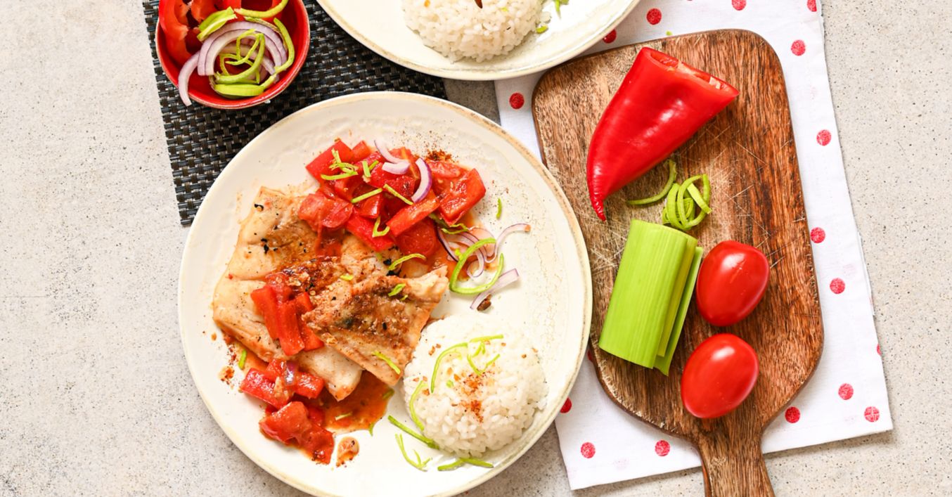 Treska s paprikami a rajčaty