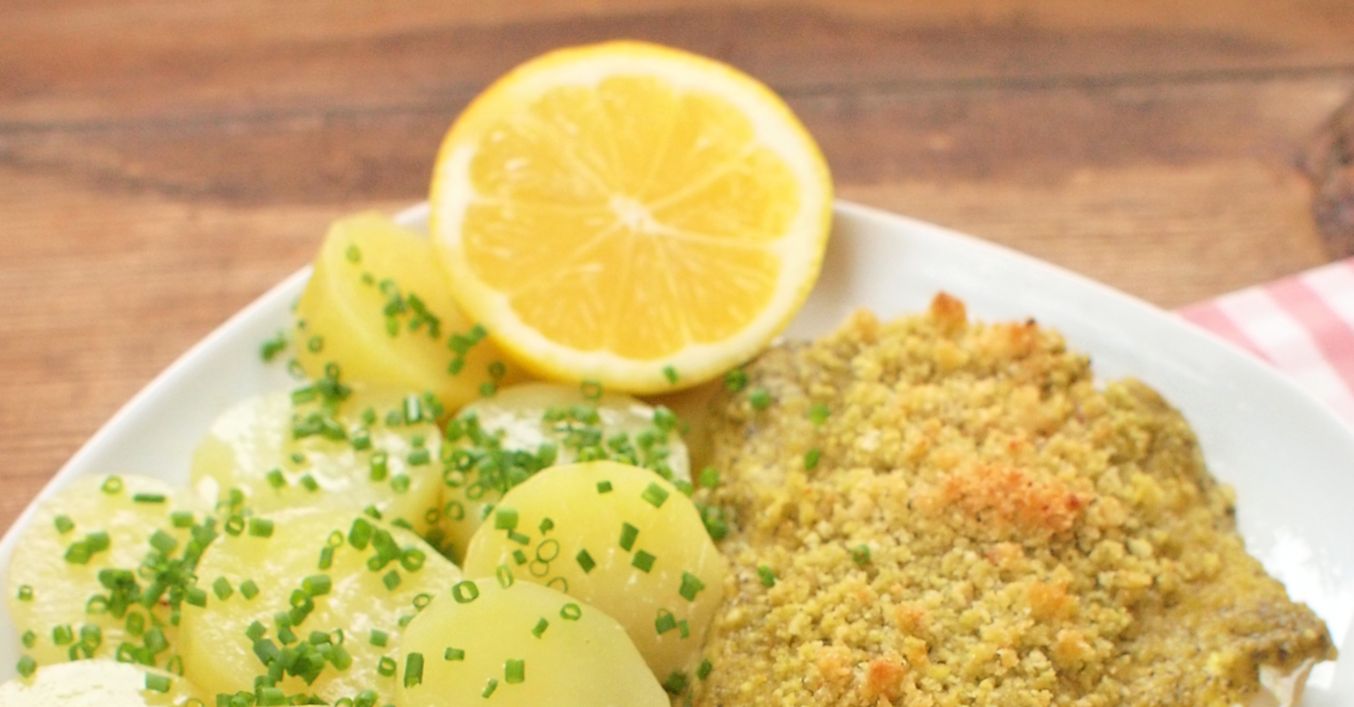 Připravené filety potřeme pestem a zasypeme směsí strouhanky a nasekaných pinií.