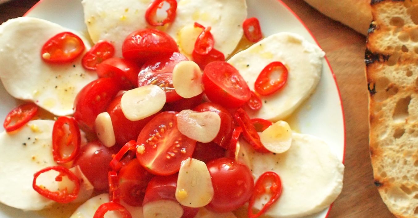 Česnek oloupeme a nakrájíme na tenké plátky. Rajčata očistíme a rozpůlíme. Chilli papričky očistíme, zbavíme stopky s jadérky a nakrájíme na tenká kolečka. Mozzarellu scedíme a nakrájíme na plátky.