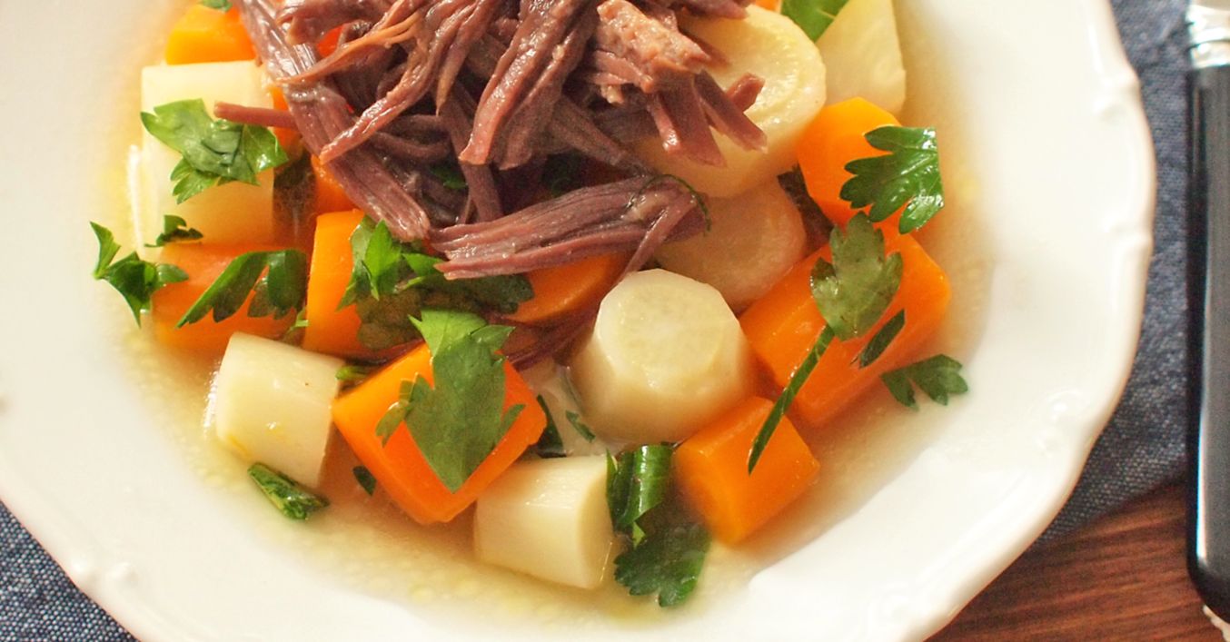 Uvařená žebra dáme stranou, obereme a natrháme na vlákna. Z vývaru vylovíme kořenovou zeleninu a podáváme ji společně trochou vývaru a natrhaným hovězím masem.