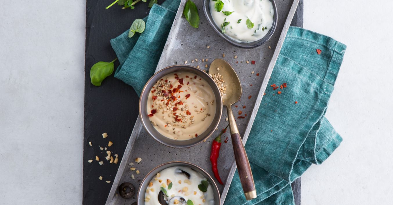 Tři druhy veganských majonéz podáváme např. s grilovanou zeleninou nebo s tofu.