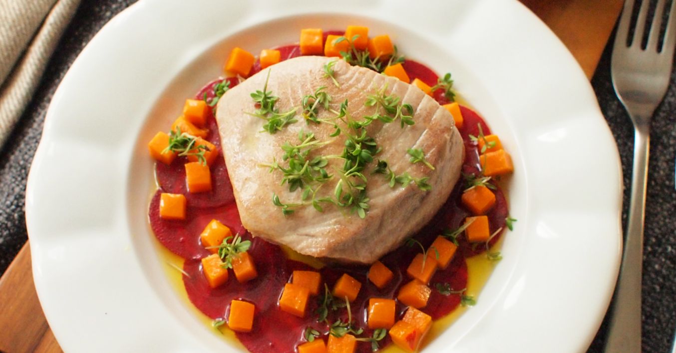 Tuňák s marinovanou červenou řepou a dušenou dýní na víně
