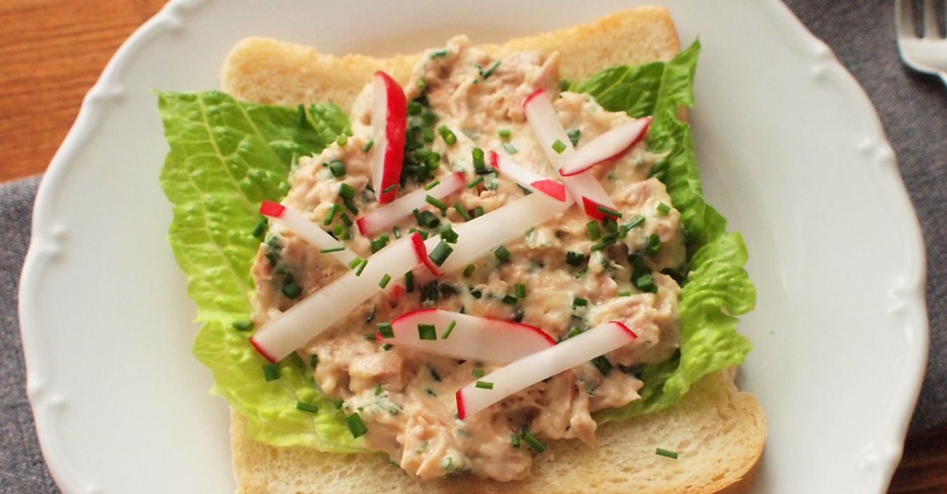 V misce rozmícháme tuňáka, vejce, majonézu, jogurt a pažitku. Dobře promícháme a dochutíme trochou citronové šťávy. Plátky chleba ozdobíme salátem a potřeme tuňákovou pomazánkou.