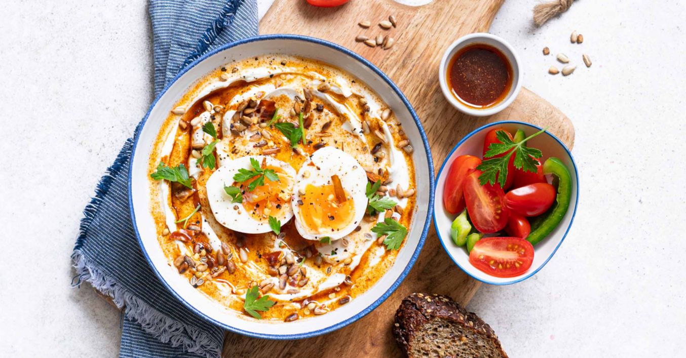 Do misky dejte zakysanou smetanu, pošírovaná vejce a poljte kořeněným máslem. Posypte nasekanou čerstvou petrželkou, slunečnicovým semínkem a mletou paprikou. Podávejte se zeleninou a pečivem.
