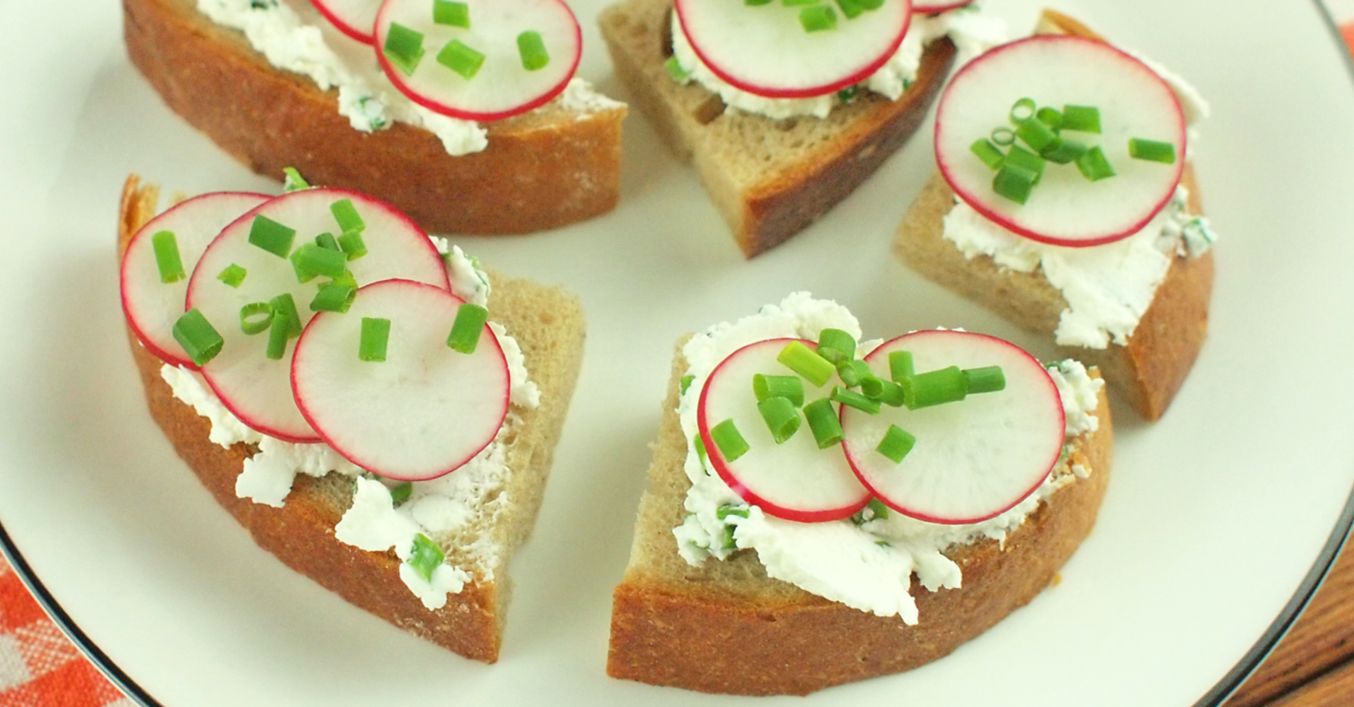 Rybičky namažeme pažitkovým tvarohem, přidáme ředkvičky a podáváme.