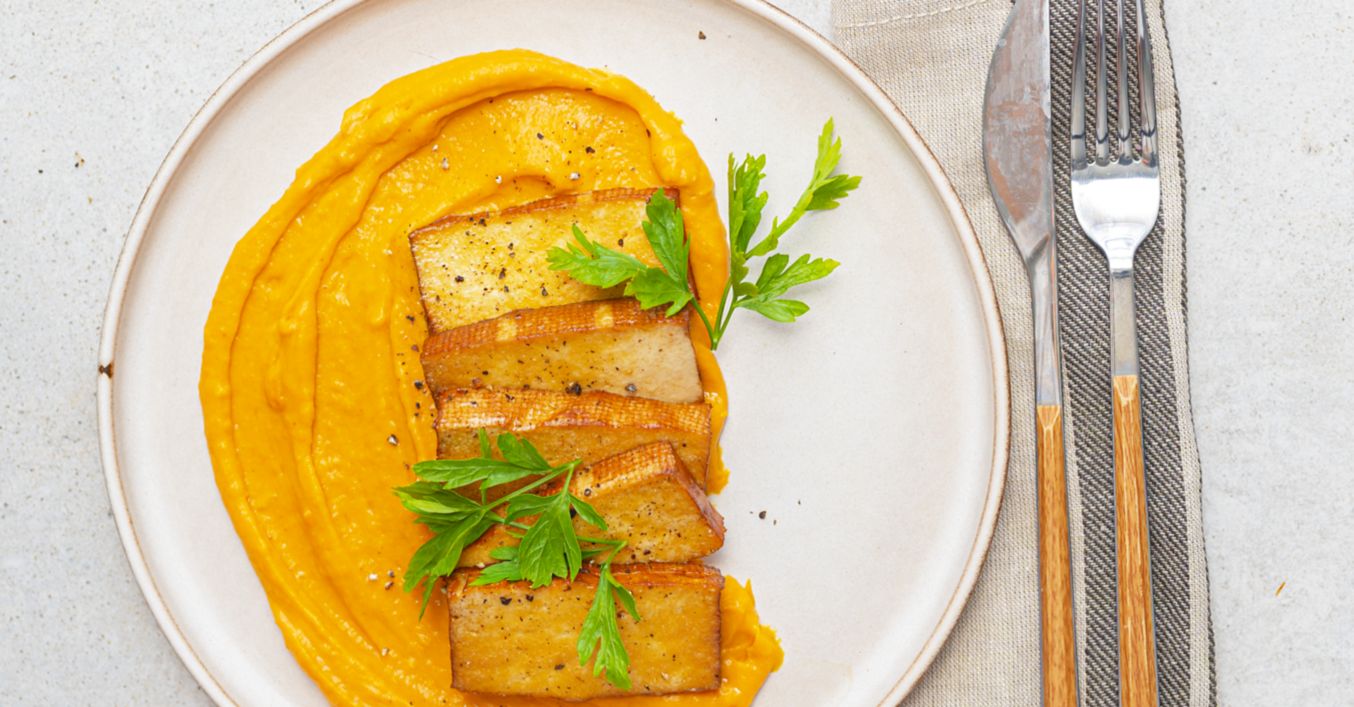 Uzené tofu nakrájejte na plátky. Na oleji orestujte z obou stran. Podávejte s pyré a čerstvou petrželkou.