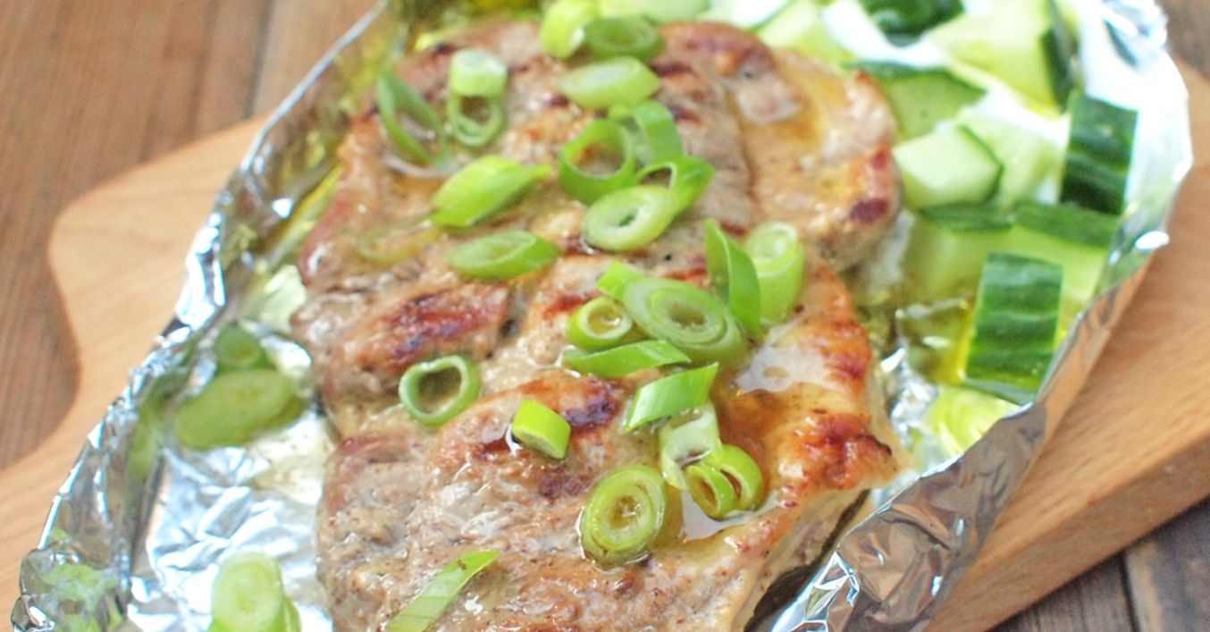 Marinovanou krkovici vyjmeme z marinády a nejprve krátce ogrilujeme na vyšším žáru z obou stran (dohromady asi jen 3 až 4 minuty). Poté dáme stranou a společně s jarní cibulkou zabalíme do alobalu. Dáme na nepřímý a mírný žár a dopečeme asi 30 minut.