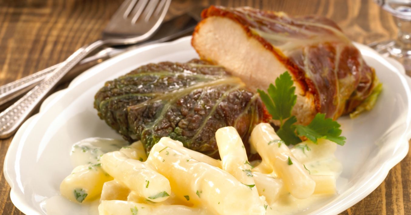 Krůtí prsa osušíme utěrkou a na rozehřátém oleji je krátce opečeme z obou stran dozlatova. Listy kapusty očistíme a asi na tři minuty je spaříme ve vařící vodě, aby změkly.