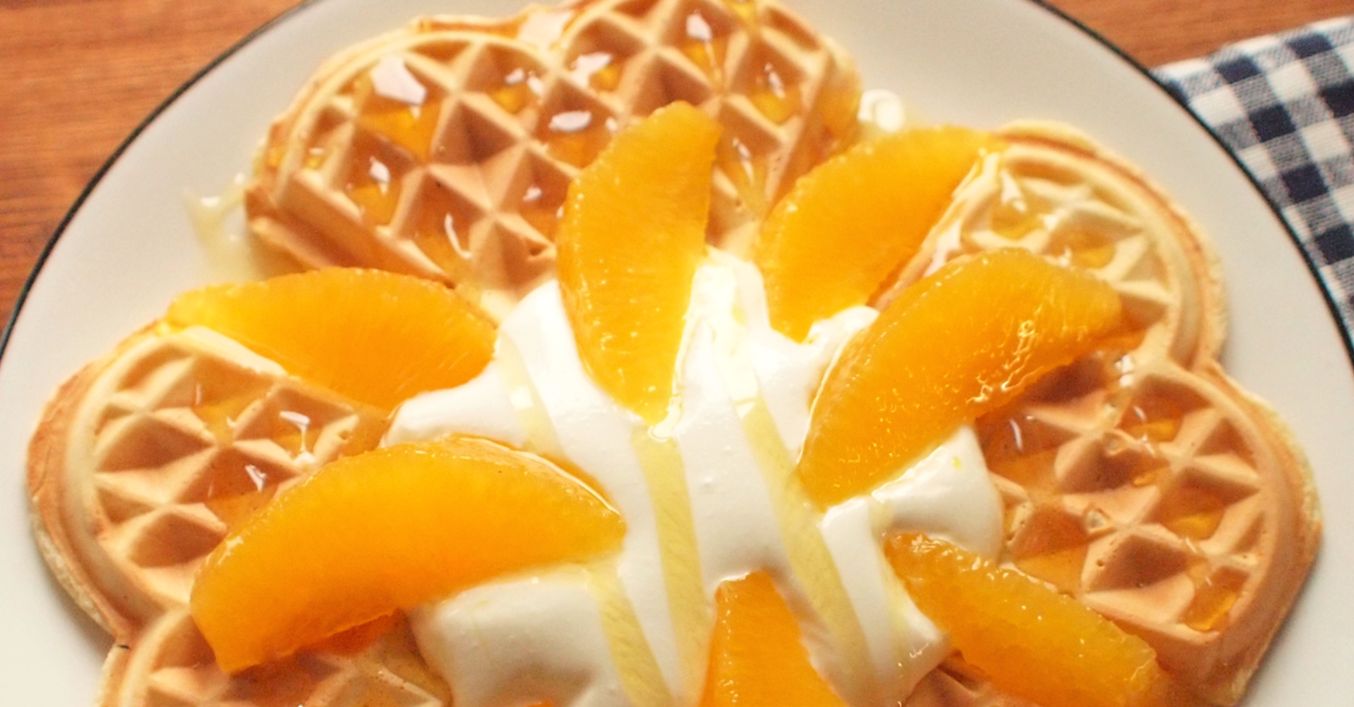 Odleželé těsto dávkujeme naběračkou do rozehřátého vaflovače. Pečeme asi 4 až 5 minut dozlatova. Horké vafle zdobíme smetanou, medem a dílky pomeranče.