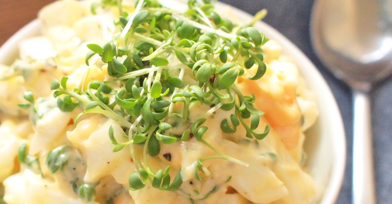V míse promícháme vejce, šalotku, řeřichu, majonézu a hořčici. Společně utřeme a dochutíme solí, pepřem a trochou bylinkového octa.