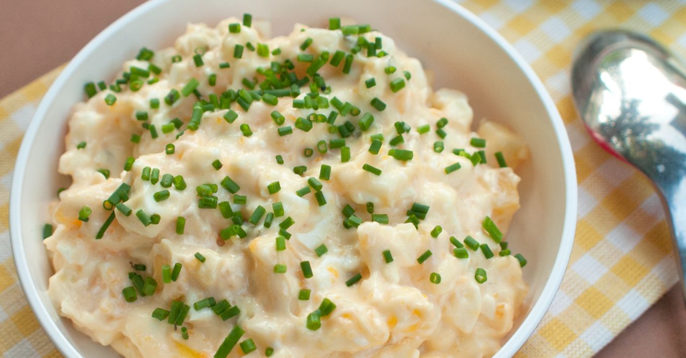 Vejce, brambory, cibuli, majonézu i hořčici dáme do mísy a důkladně promícháme. Osolíme, opepříme a podáváme ozdobené pažitkou.