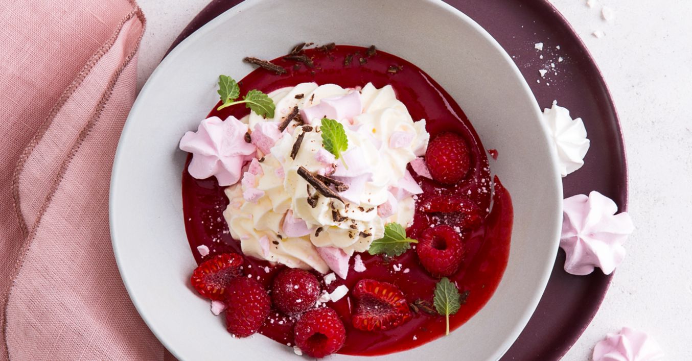 Na dno dezertních talířků nandáme maliny, přidáme šlehačku s pusinkami a podáváme.