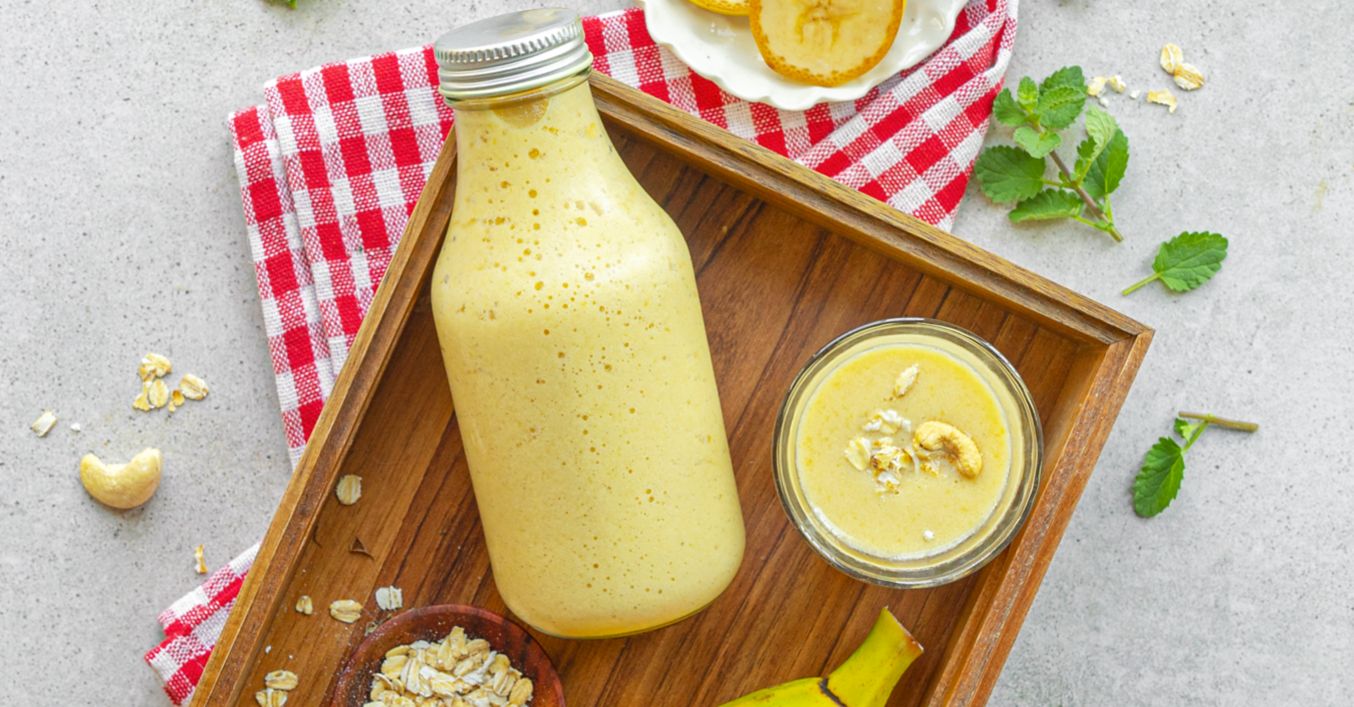 Banán rozmixujte s mlékem, vločkami, medem, kešu ořechy a vanilkovým proteinem. Hned podávejte.
