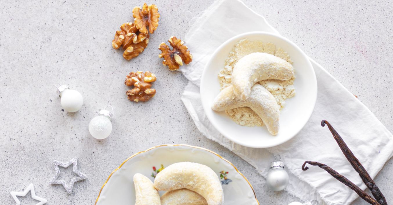 Malé kousky těsta rozválejte a vytvarujte do tvaru rohlíčku. Rohlíčky dávejte na plech vyložený pečícím papírem a pečte 10 minut v troubě vyhřáté na 170 °C.