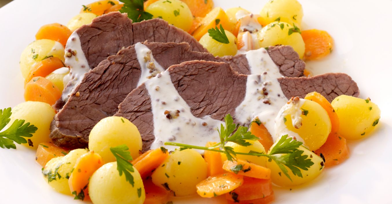 Jogurt, zakysanou smetanu a obě hořčice promícháme a podáváme spolu s vařeným hovězím masem na plátky a s mrkvovými brambory.