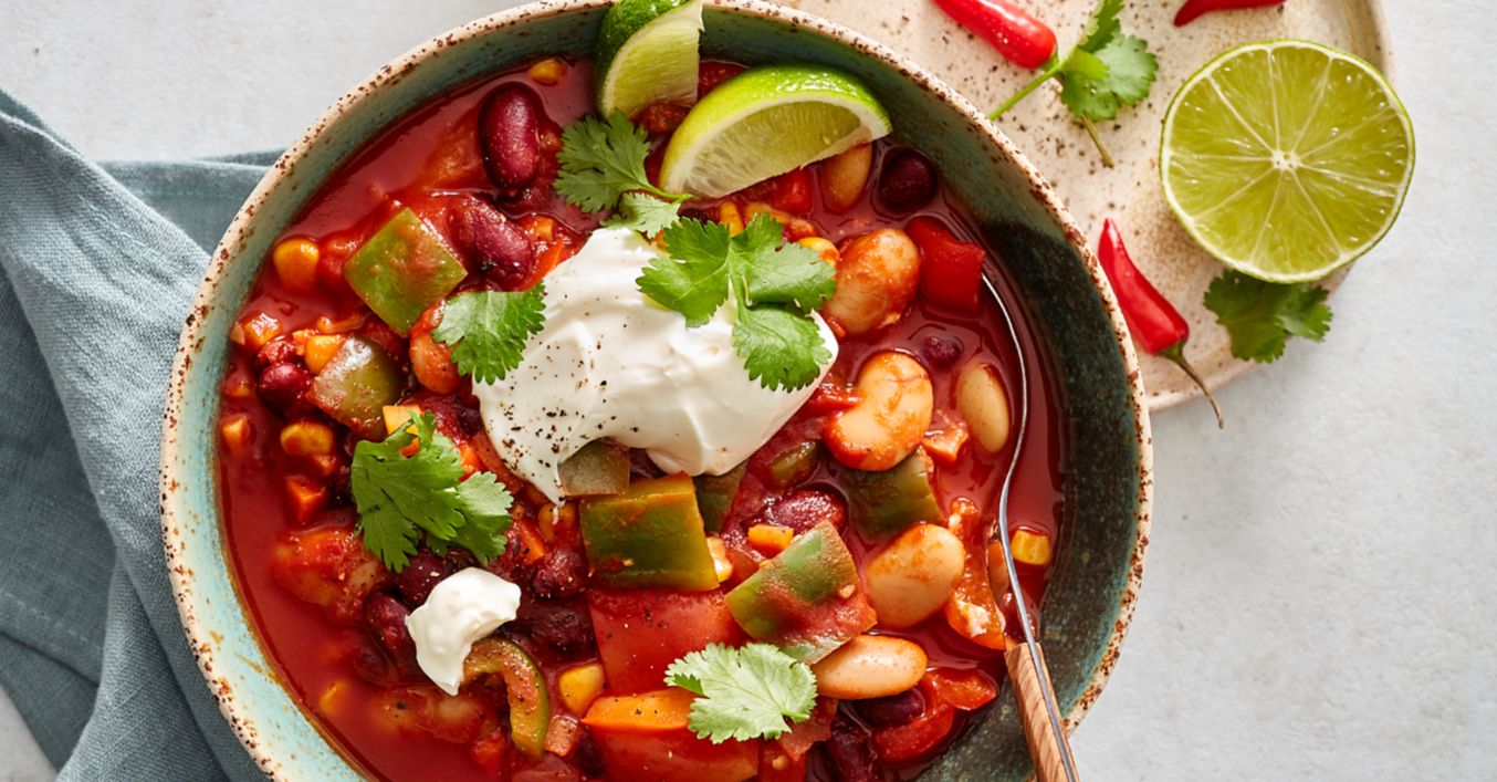 Limetku omyjte v horké vodě, osušte a nakrájejte na měsíčky. Koriandr omyjte, osušte a otrhejte lístky. Veganské chilli podávejte posypané zakysanou smetanou, měsíčky limetky a koriandrem.