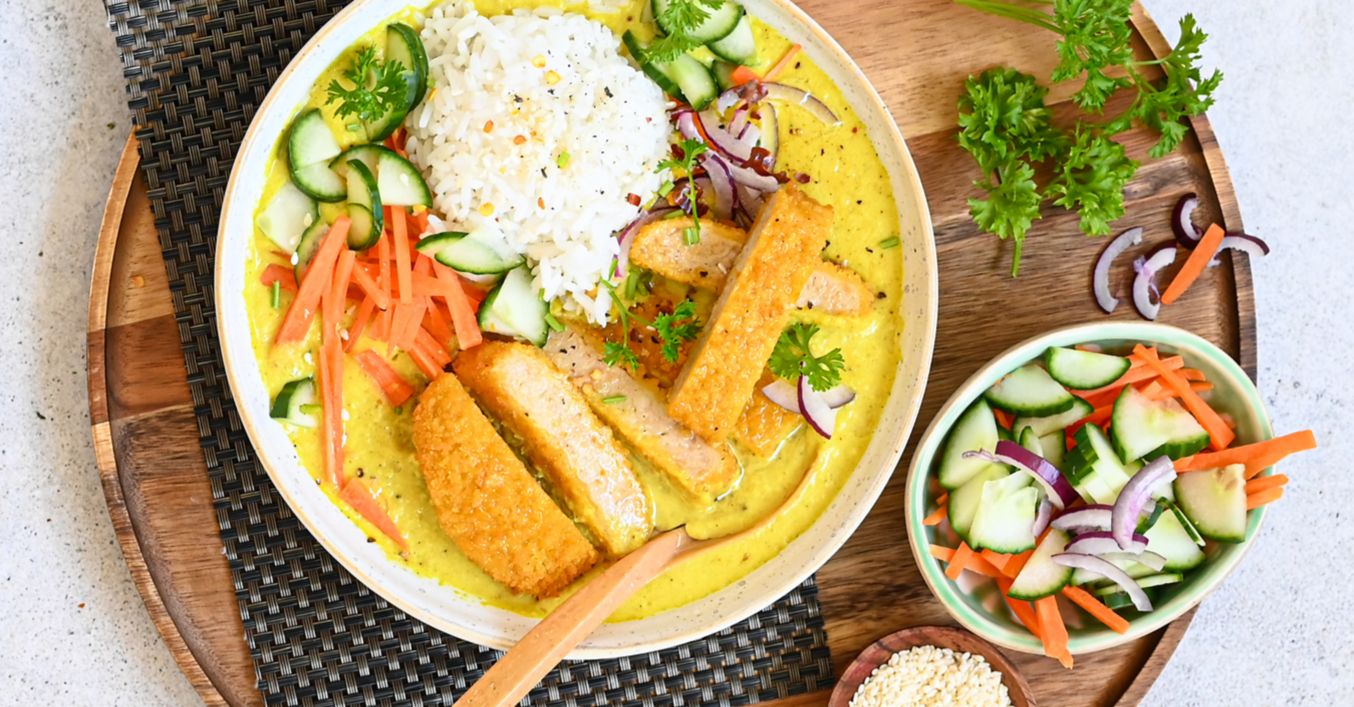 Katsu kari podávejte s uvařenou rýží, zeleninou, bylinkami a veganským řízkem K-take it veggie.