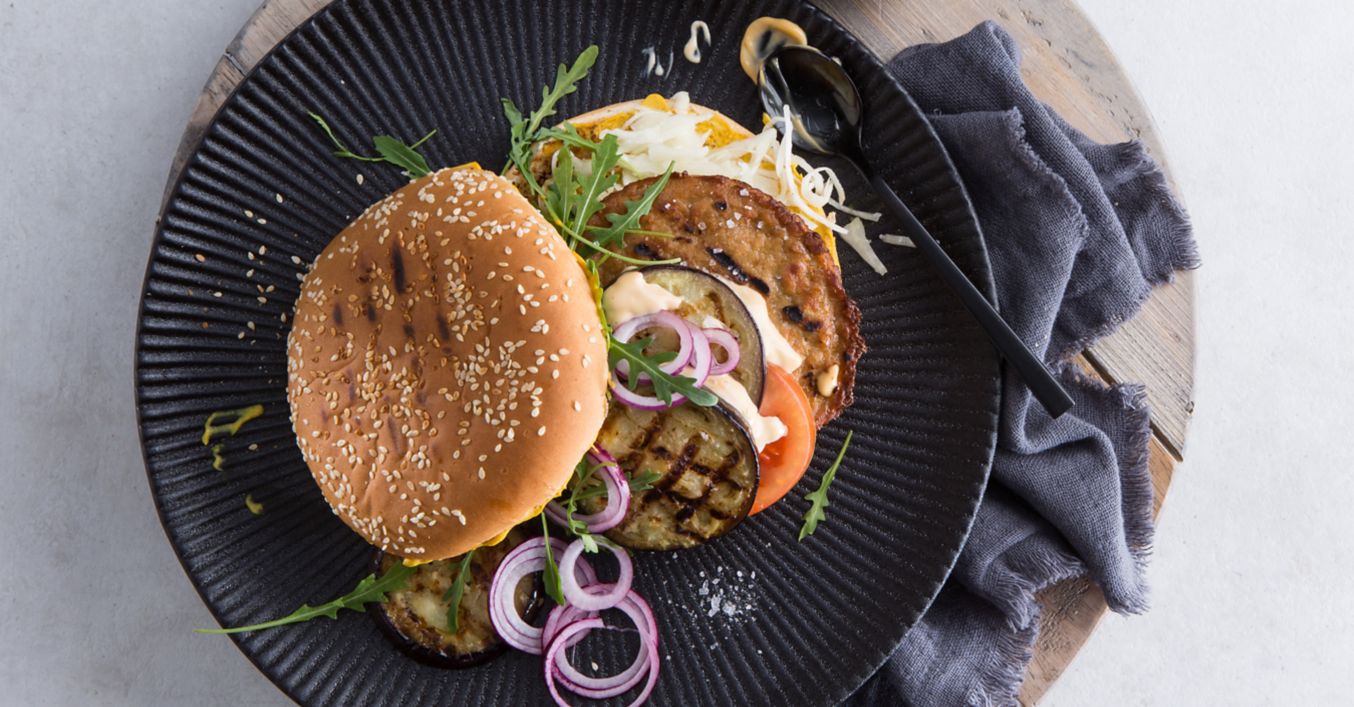 Poté vrstvíme na housky v tomto pořadí zelný salát, grilovaný burger, plátek rajčete, grilovaný lilek a kroužky čerstvé cibule. Nakonec přidáme do burgerů majonézu, lístky rukoly a přiklopíme druhou polovinou housky.