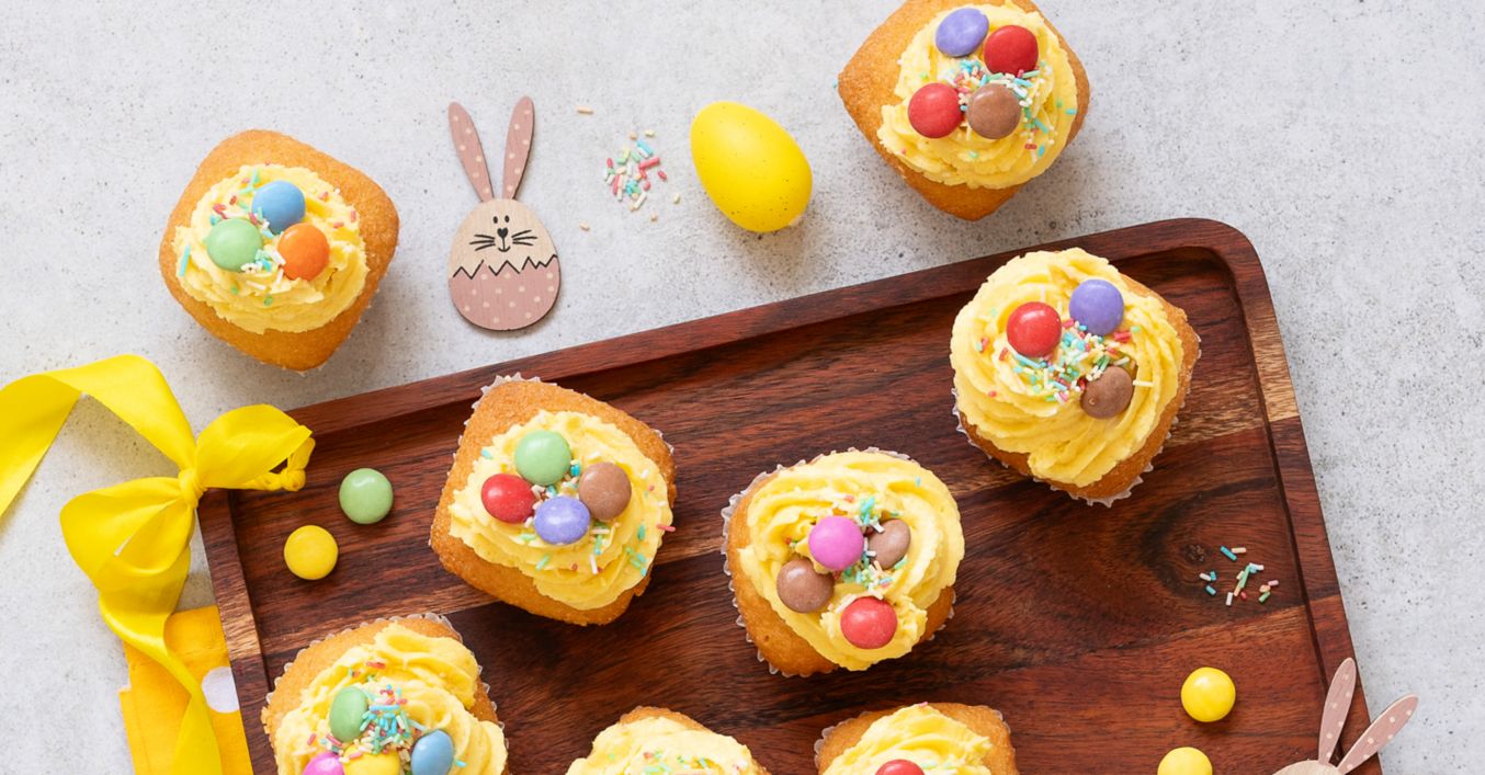 Upečené dortíčky ozdobte krémem, lentilkami a cukrovým zdobením.