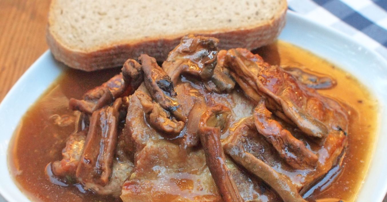 Když je krkovice upečená, dáme ji stranou. Pekáč přeneseme na sporák a zalijeme zbylým vývarem. Krátce povaříme a podáváme spolu s krkovicí, kterou naporcujeme na plátky.